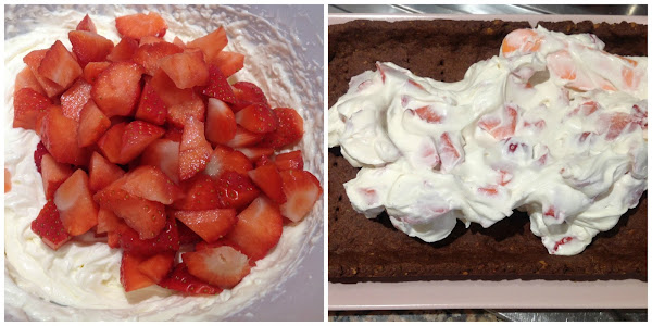 Ponemos en un bol el queso, la nata (crema de leche) y el azúcar. Batimos hasta obtener una crema espesa. Limpiamos, troceamos las fresas y las incorporamos a la crema.