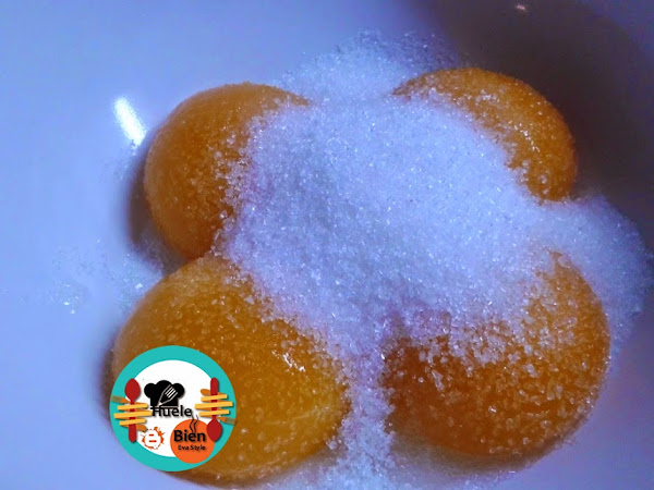 3.- Mezclamos las yemas de los huevos con el azúcar. ( Las claras las guardamos para montar el merengue). Batimos bien hasta conseguir una crema homogénea. Reservamos.