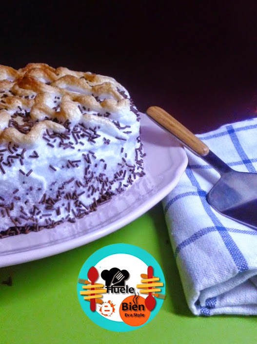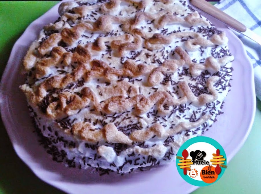 11.- Rellenamos cubrimos la base de la tarta con la crema pastelera, dejamos los borde sin cubrir. Ponemos la otra mitad sobre del bizcocho sobre el pastel. Metemos el merengue en una manga pastelera. Cubrimos el bizcocho con el merengue, lo distribuimos bien con la ayuda de una espátula de silicona. Hacemos unos dibujos sobre la tarta y horneamos unos 10 minutos, hasta que se dore el merengue. A 180ºC. Cubrimos la tarta con virutas de chococlate.