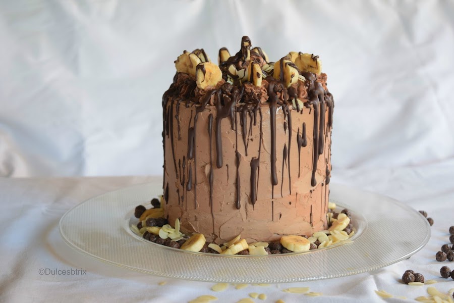 Con estas cantidades hice los dos bizcochos de 15 cm por 10 y los monte en una sola tarta de capas alternando bizcocho y crema de chocolate con almíbar de canela y naranja. La cubrí toda con la crema de chocolate y la decore como dije antes, plátano, almendra, cereales y más y más chocolate.... Estaba deliciosa!!!
