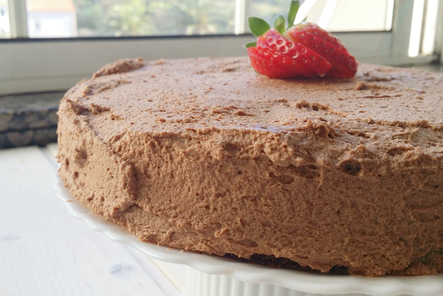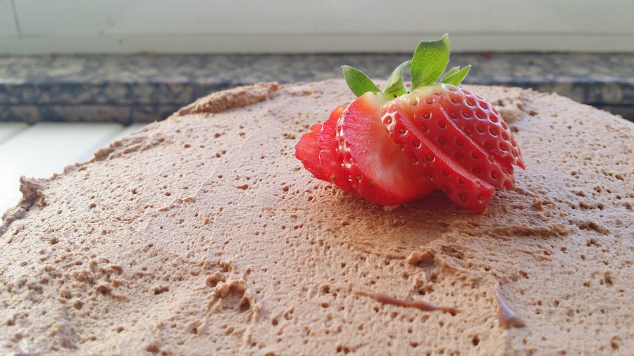 7. Montamos nuestra ganache con ayuda de unas varillas, como si se tratase de nata montada (crema de leche). Abrimos el bizcocho a la mitad con cuidado. Rellenamos con parte de la ganache, y luego cubrimos la tarta por encima con la misma crema.