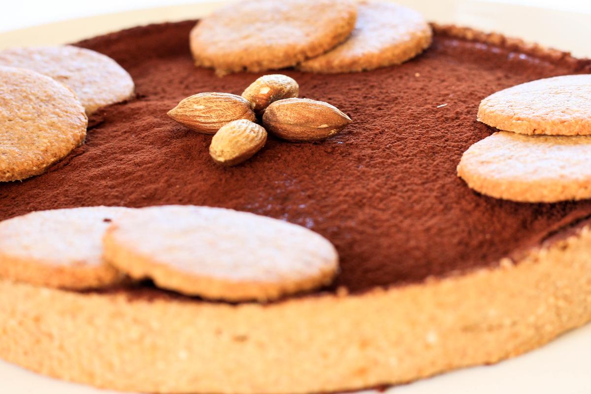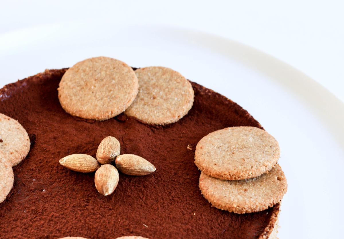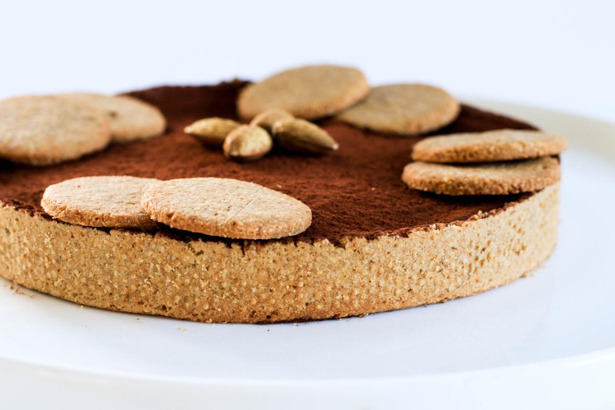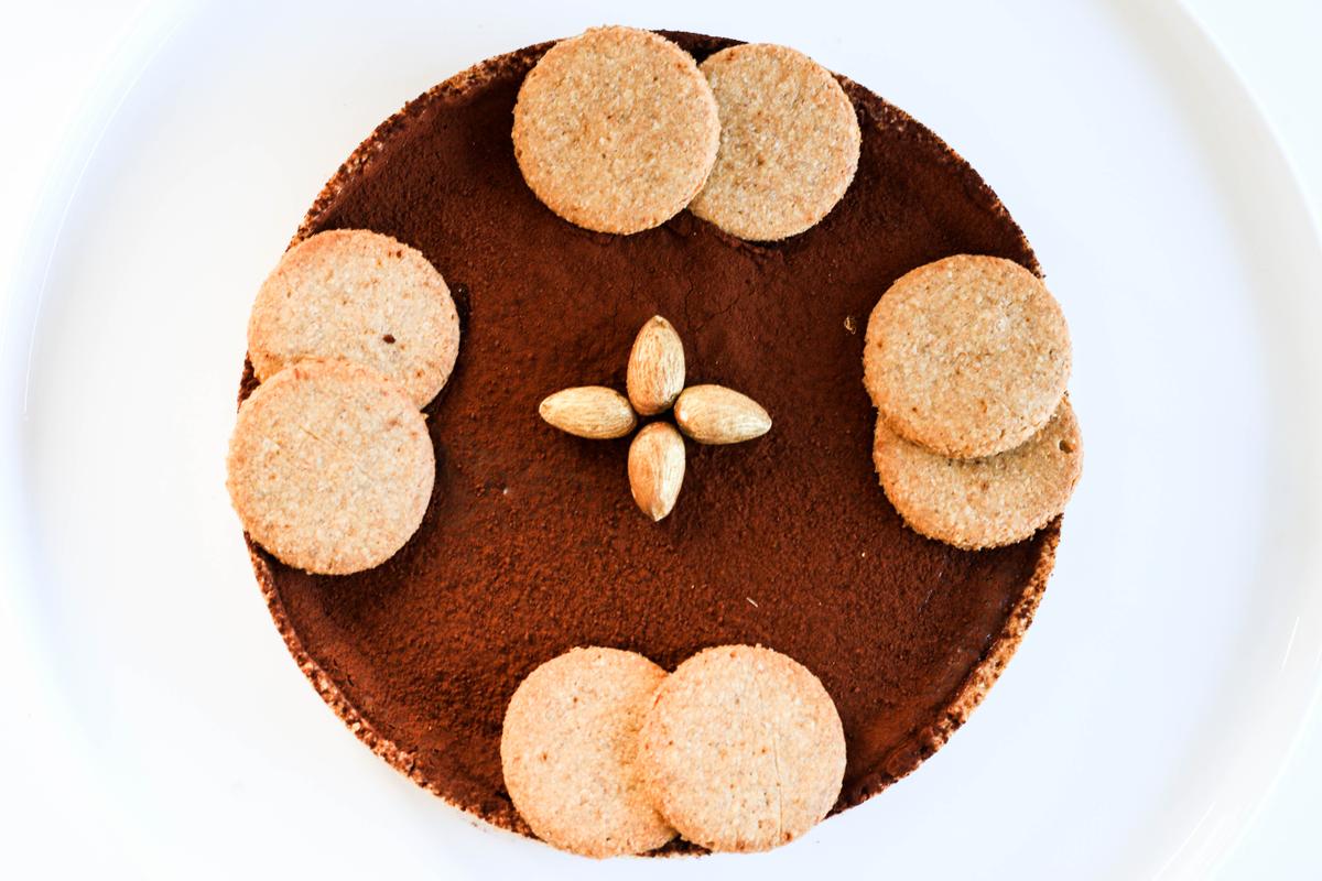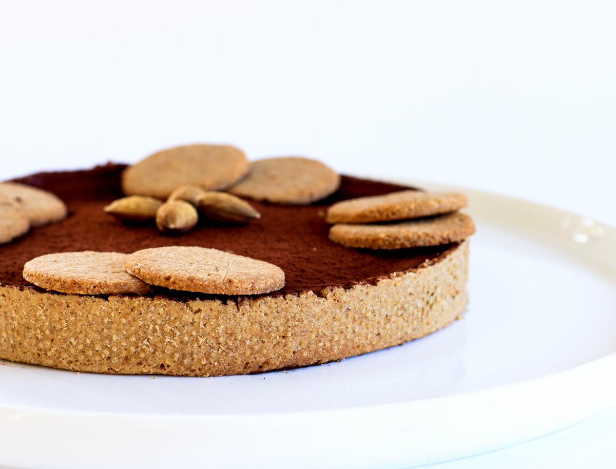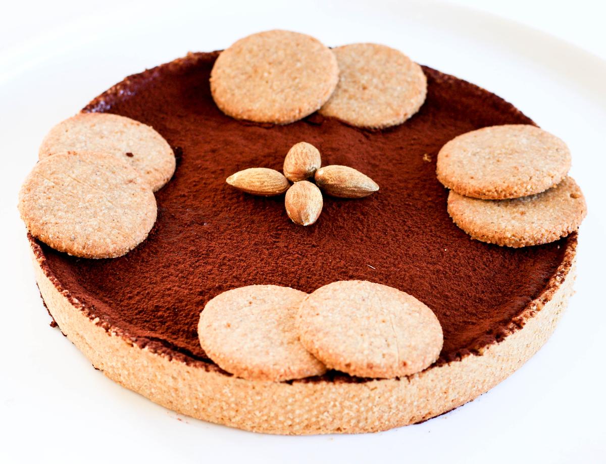 Tarta de chocolate hecha con una masa quebrada de harina integral y almendras, con un relleno de leche condensada sin azúcar hecha en casa.