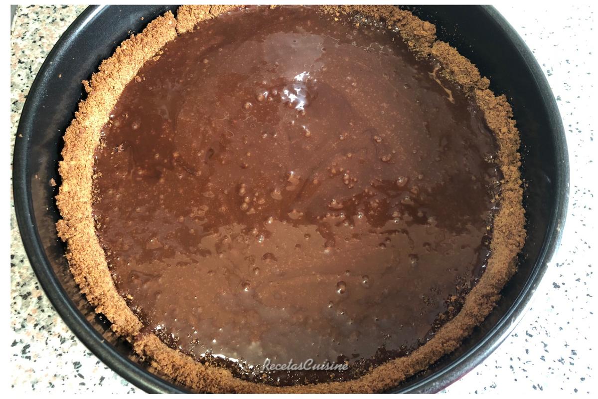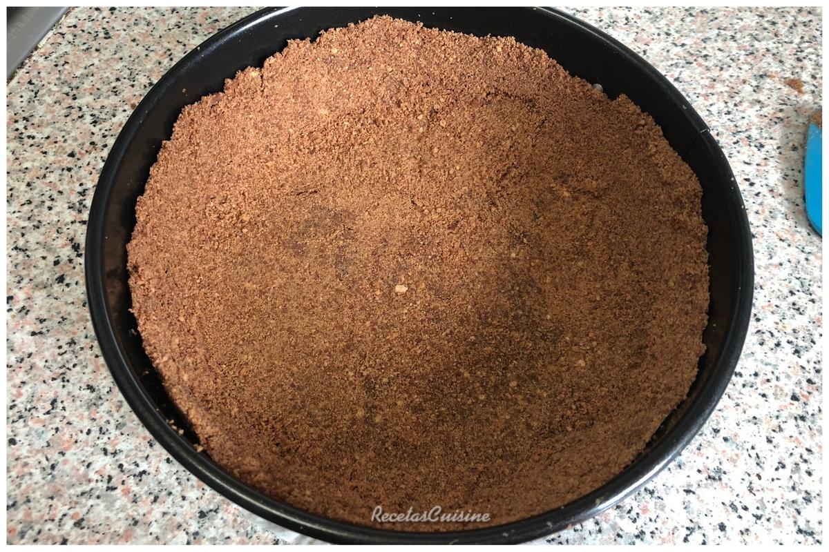 3. Cubrimos el fondo de un molde de 18-20cm con papel de horno. Añadimos la mezcla de galletas y vamos prensando bien, formando la base y las paredes del molde. Cocemos con el horno precalentado a 180º durante 15 minutos. Sacamos del horno y dejamos enfriar, primero a temperatura ambiente, y después guardamos en la nevera mientras seguimos preparando la tarta.