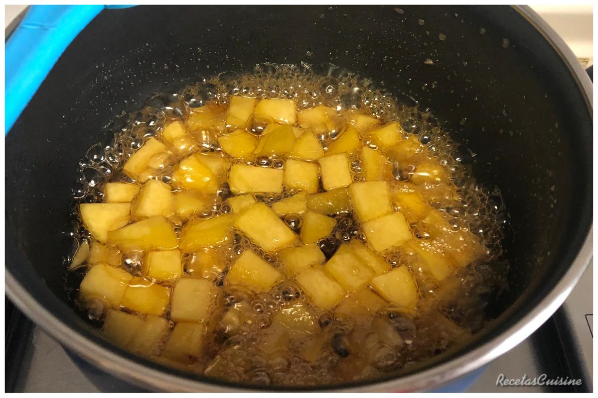7. Para hacer el melocotón en almíbar, lo pelamos y lo troceamos en daditos. Lo ponemos en un cazo y añadimos el azúcar, el agua y la vaina abierta o la esencia de vainilla. Cocemos a fuego medio hasta que se forme un almíbar. Dejamos enfriar.