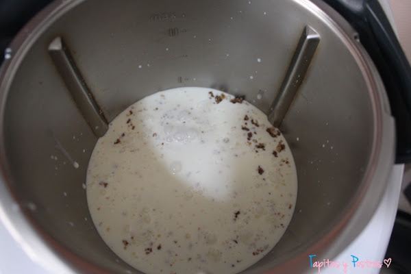 Añadimos la nata (crema de leche), leche, azúcar y los dos sobres de cuajada. Calentaremos 7 minutos a 90º y velocidad 4. Si no tenemos thermomix lo haremos en un cazo amplio, removiendo constantemente hasta que la mezcla espese.