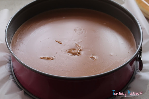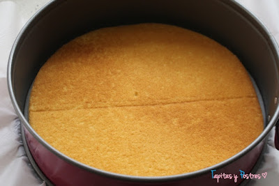 Ponemos la base de bizcocho en el fondo del molde. Mi molde era de 25 cm, un pelin más grande que la base, un poco solo. Pero si vuestro molde es más pequeño, recortaremos lo que sobre. También podemos hacer una base de galletas molidas mezcladas con mantequilla. Es la base que habitualmente pongo, pero en esta ocasión usé una plancha de bizcocho de las que venden ya hechas.