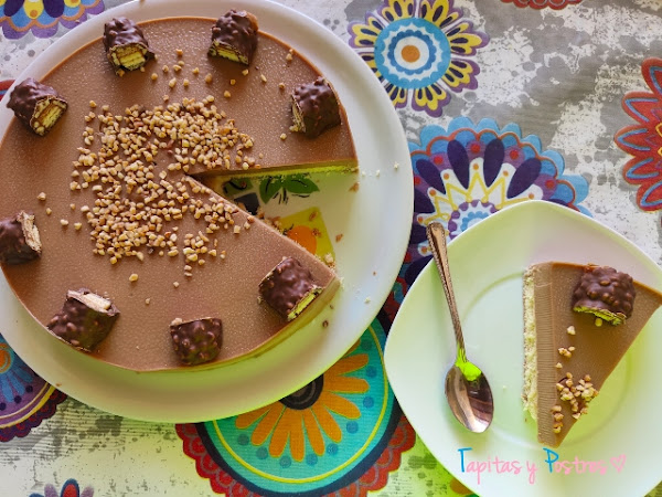 Vertemos la mezcla sobre el molde donde está la base de bizcocho y dejamos enfriar. Luego refrigeramos unas horas antes de servir. Adornaremos con trocitos de barritas y almendritas picada.