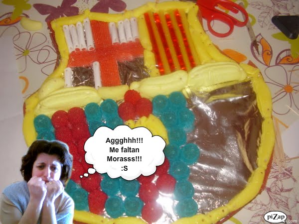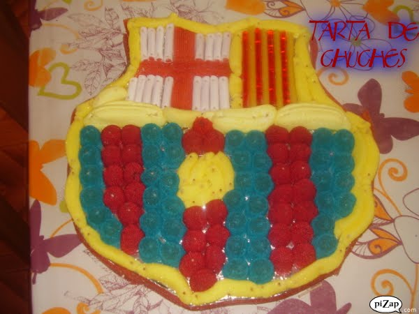 Cogemos la placa y cortamos un cuadrado de 35 cm por 35 cm. Con un lápiz rallamos la forma del escudo del Barça y la cortamos con cuidado con un cuchillo, la forramos con papel de aluminio y vamos pinchando con cuidado las chuches. Según el tamaño que necesitemos vamos cortándolas y pinchando. En fin, ya está.
