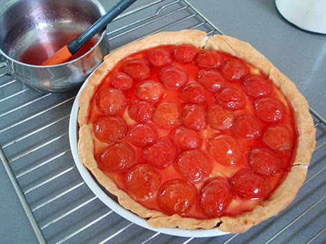 Para darle brillo una vez fría, la pintamos con el almíbar de las ciruelas y si son frescas, podemos pintarlas con un poco de mermelada de melocotón o albaricoque algo diluida en agua.