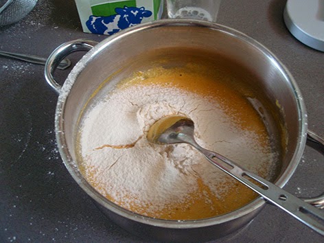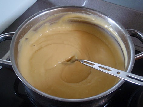 Lo llevamos al fuego entre medio y bajo y revolvemos continuamente para que no se pegue, hasta que la crema se espesa y adquiere consistencia teniendo en cuenta que cuando enfríe espesará un poco más. Se la deja llegar a cocer suavemente durante un minuto para que cueza la harina y le quede un sabor delicado.