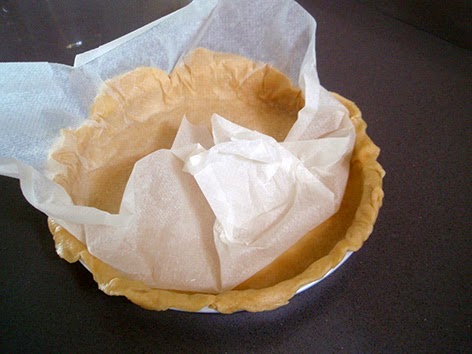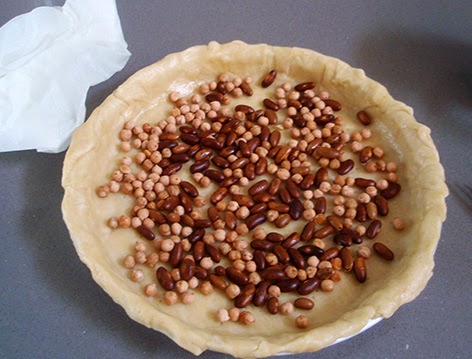 Le ponemos encima un poco de peso para que no se suba (unas legumbres o unas canicas) y la cocemos en horno precalentado a 180º durante 30 o 35 minutos o hasta que la veamos dorada y crujiente.