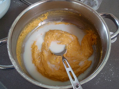 Agregamos la leche, al principio muy poco a poco, de cucharada en cucharada, para que no se formen grumos.