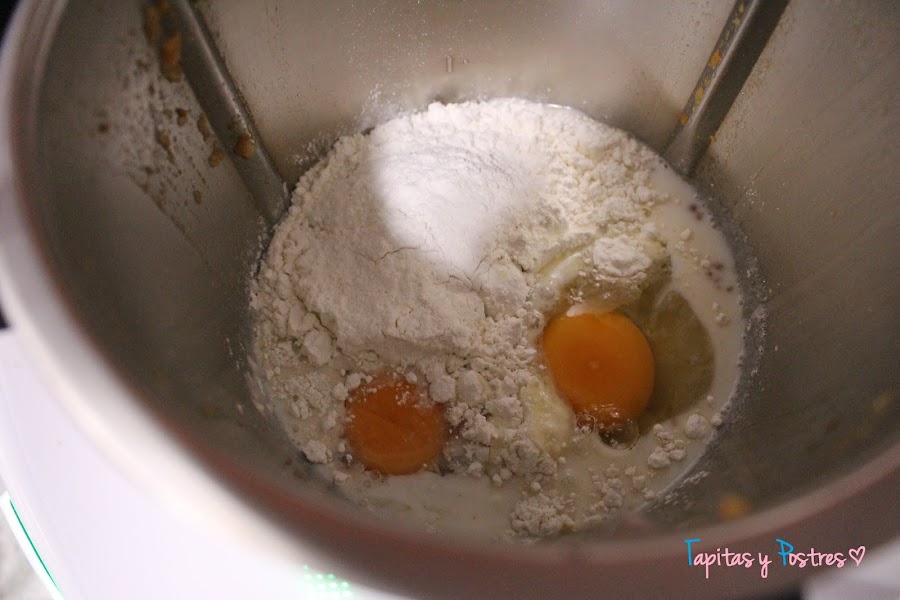 Añadimos la leche, azúcar, huevos, harina y levadura y batimos todo 20 segundos a velocidad 35.