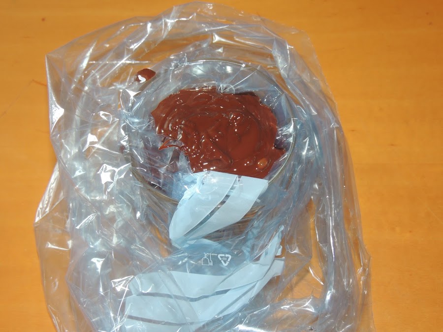 Se pone en una bolsa perfectamente limpia y se hace un agujerito con un mondadientes para que el dibujo de la decoración sea más fino. Es aconsejable poner la bolsa en un vaso para que no se manche nada.