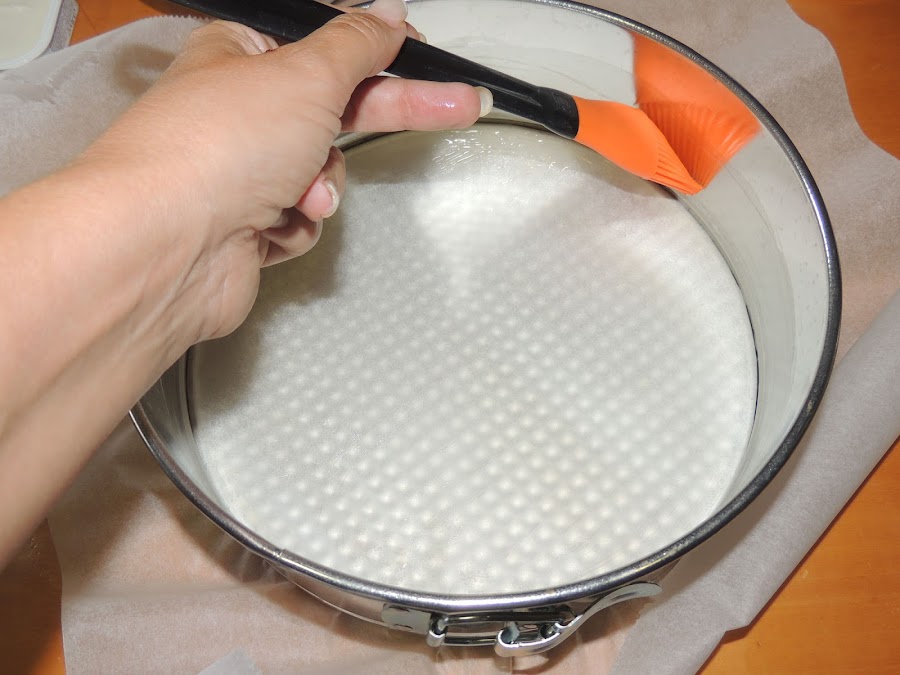 En la base del molde, se pone papel vegetal y se unta con mantequilla, los restos que quedan en el recipiente valen.