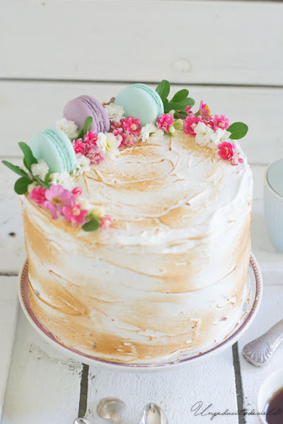 Yo lo quemé con el soplete y usé unas florecita de mis macetas de las ventanas y unos macarons que tenía en el congelador. No te preocupes si no tienes macarons o flores usa tu imaginación y decórala con lo que tengas a mano o más te guste.