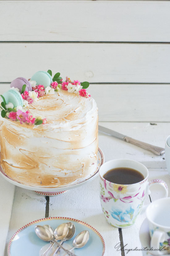 Cubrimos con una capa generosa de merengue, cuando cubrimos de merengue no suele hacer falta una capa tapamigas, pero en esta ocasión si la puse porque soltaban muchas miguitas los bizcochos, lo dejo a tu criterio.