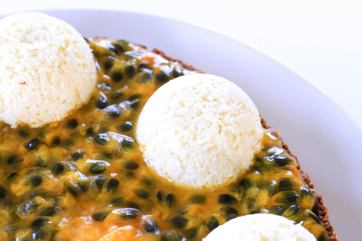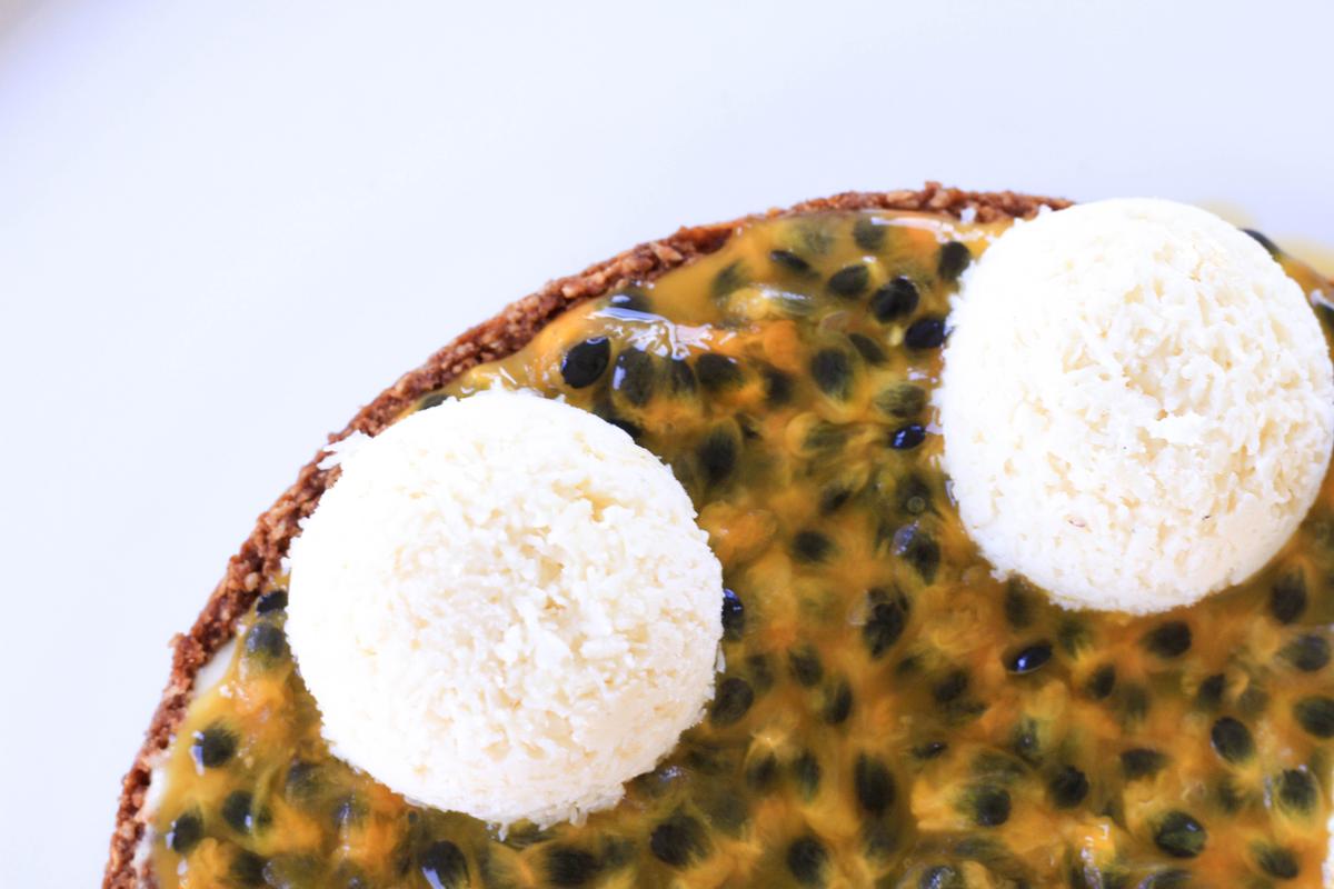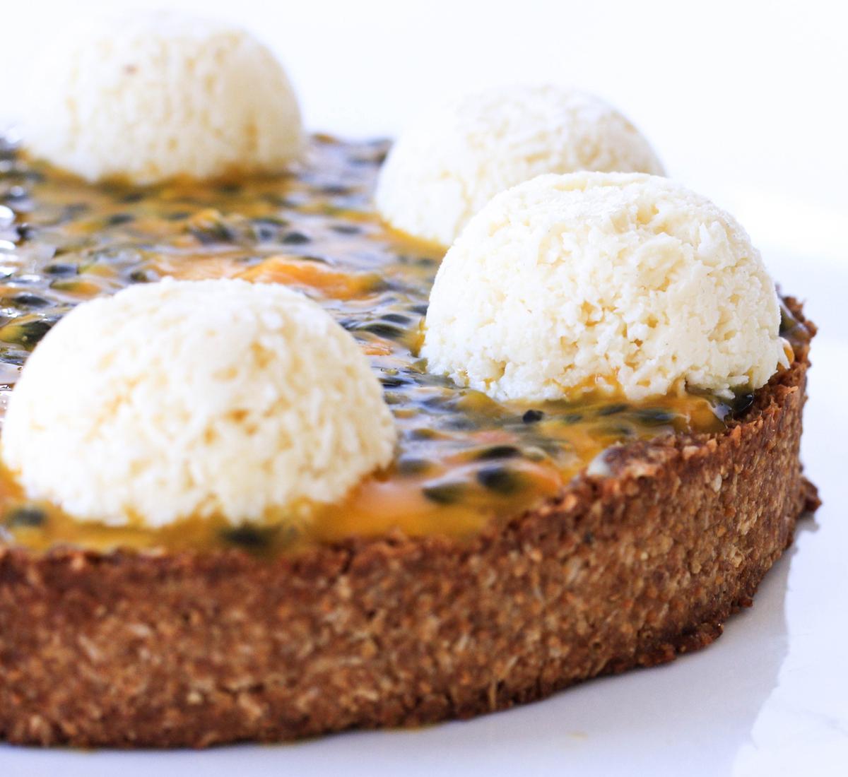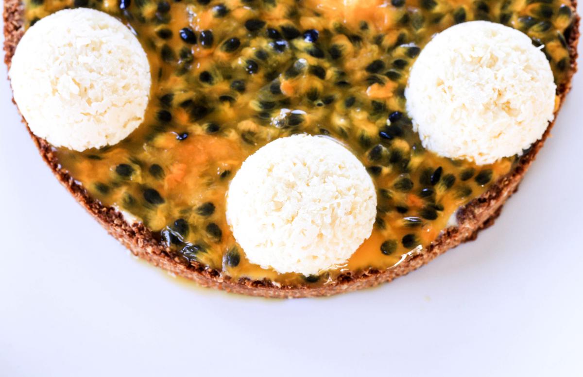 Tarta de coco y maracujá . Una base crocante, una crema de coco dulce y de sabor suave, y una crema de maracujá dulce con un toque ácido. Encima, todo saludable.
