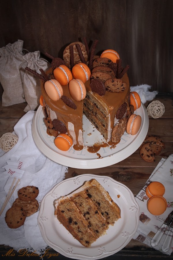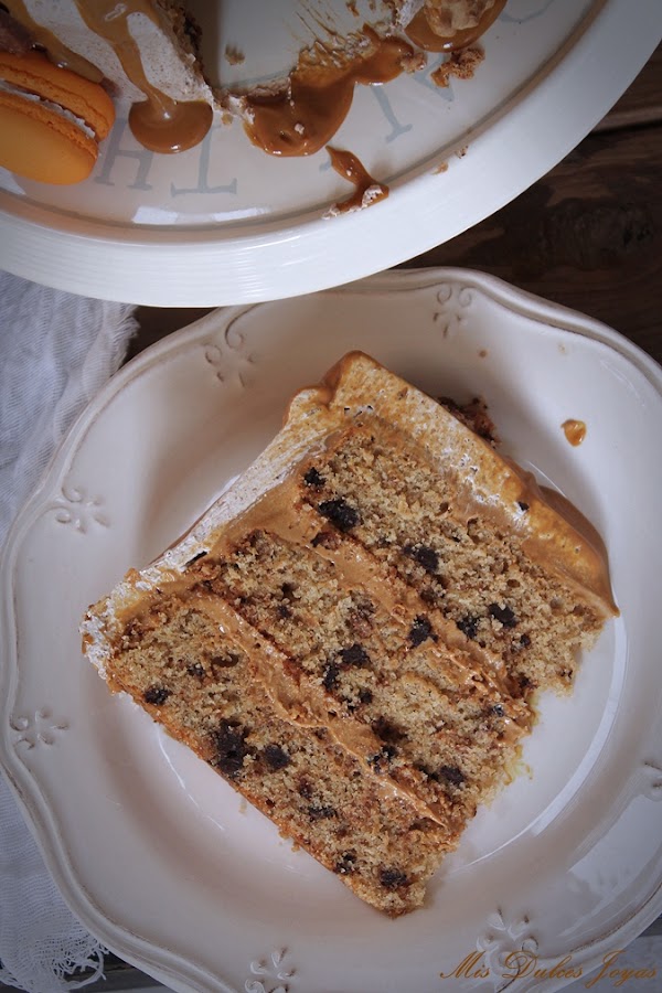 Le di mucha vuelta al tema y lo que se me ocurrió es hacer una tarta con bizcochos de cookies, a los que he añadido chips de chocolate (para potenciar ese toque de los trocitos de chocolate que llevan las cookies), y una sencilla y deliciosa crema de dulce de leche (ya que está hecha solo con dos ingredientes mantequilla y dulce de leche).