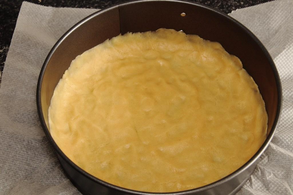 Extendemos la masa quebrada por el fondo y parte de las paredes del molde, procurando que quede fina y del mismo grosor por todas partes. Dejamos en la nevera refrigerando mientras organizamos el resto de la receta.