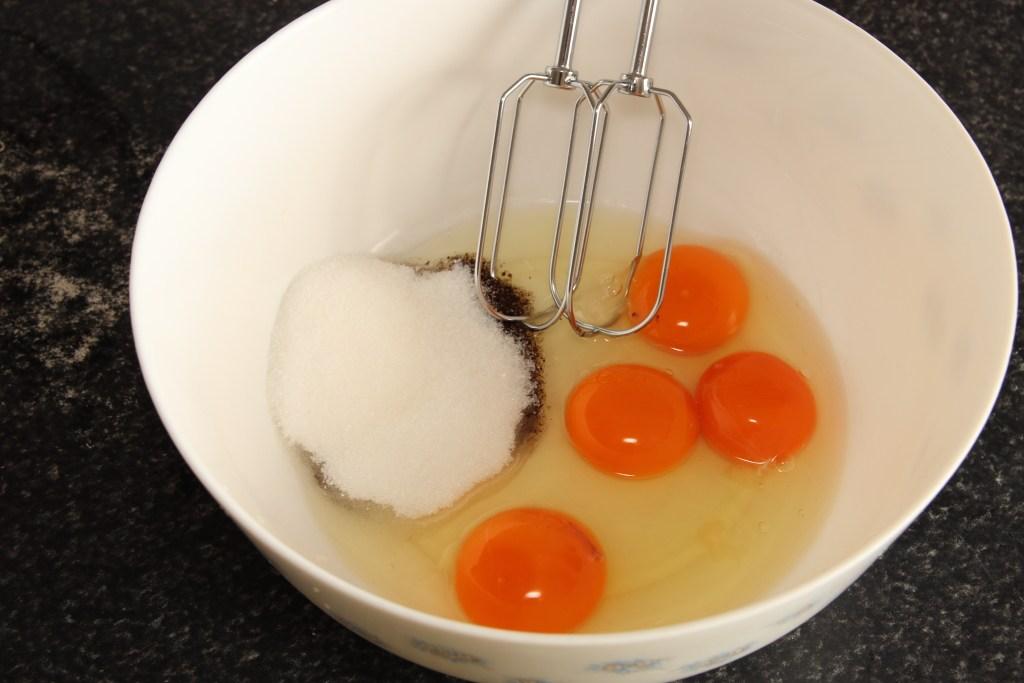 Colocamos la nata (crema de leche) en un cazo y la ponemos a calentar lentamente, sin que llegue a hervir. Por otro lado en un bol batimos los huevos y las yemas junto con el azúcar blanquilla y la vainilla, con las varillas eléctricas.