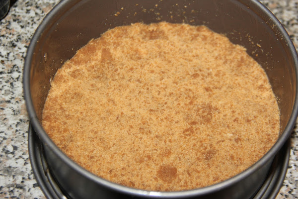 Comenzamos preparando la base de la tarta. Para ello picamos bien las galletas y las mezclamos con la mantequilla derretida. Forramos un molde desmoldable (el mio de 15 centímetros) y reservamos en la nevera.