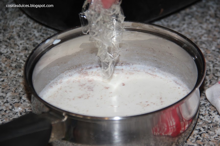 En la leche que tenemos en el cazo disolvemos, una vez que ha hervido, la gelatina previamente hidratada.