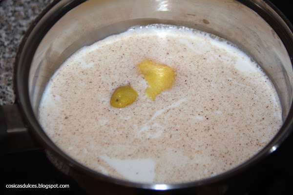 Para preparar la crema comenzamos hirviendo 400 mililitros de la leche con la piel de limón y la canela (yo me olvide de comprar en rama y le puse en polvo).