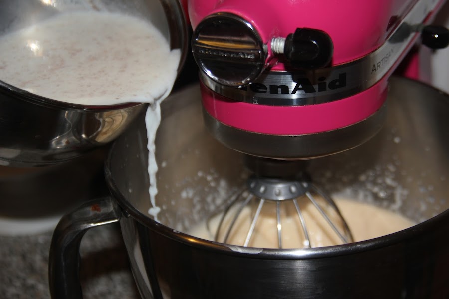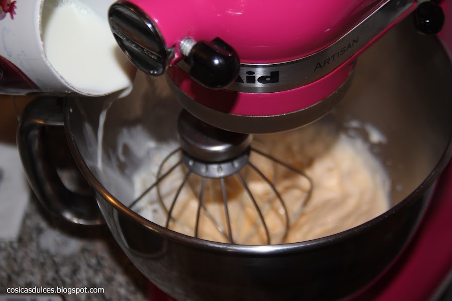 Vertemos esta mezcla sobre el batido de yemas, azúcar y maizena que tenemos reservado. Sin dejar de batir en ningún momento para evitar que con la leche caliente se cocinen las yemas.