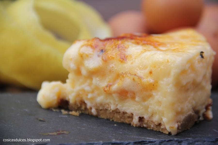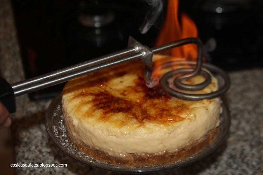Reservamos la tarta en la nevera, mejor de un día para otro. Antes de servir, espolvoreamos con azúcar y quemamos con un soplete o unas placas.