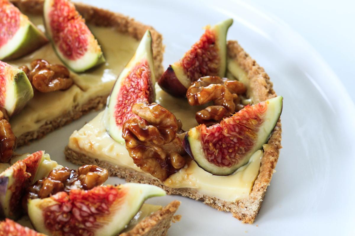 Tarta de higos y nueces caramelizadas, hecha con una base integral crocante, crema de vainilla suave, higos frescos y nueces.