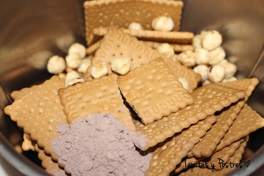 Hacemos la base, trituramos las galletas, avellanas y cacao.