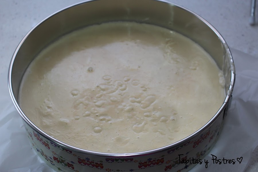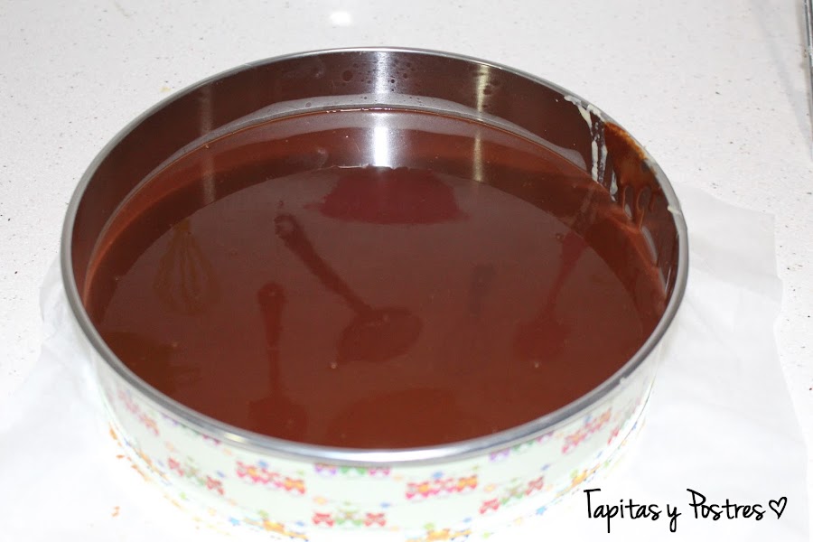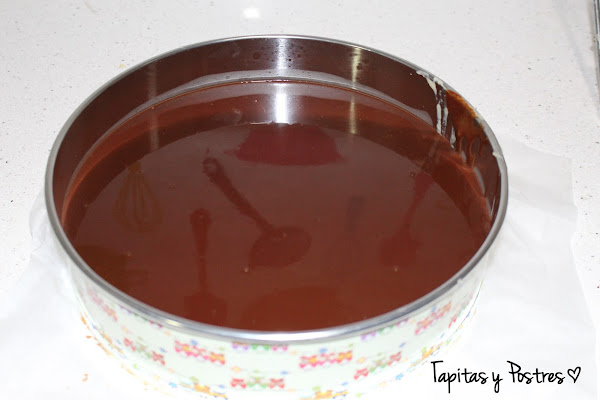 Echamos la cobertura sobre la tarta sin desmoldar. De nuevo dejamos enfriar.