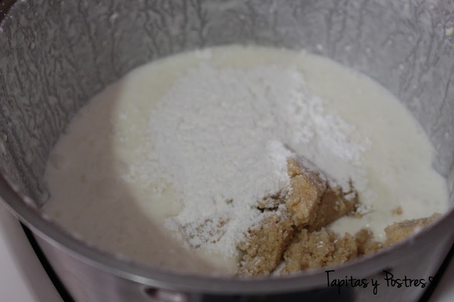 Y le añadimos la leche, nata (crema de leche) y vainilla. Mezclamos bien.