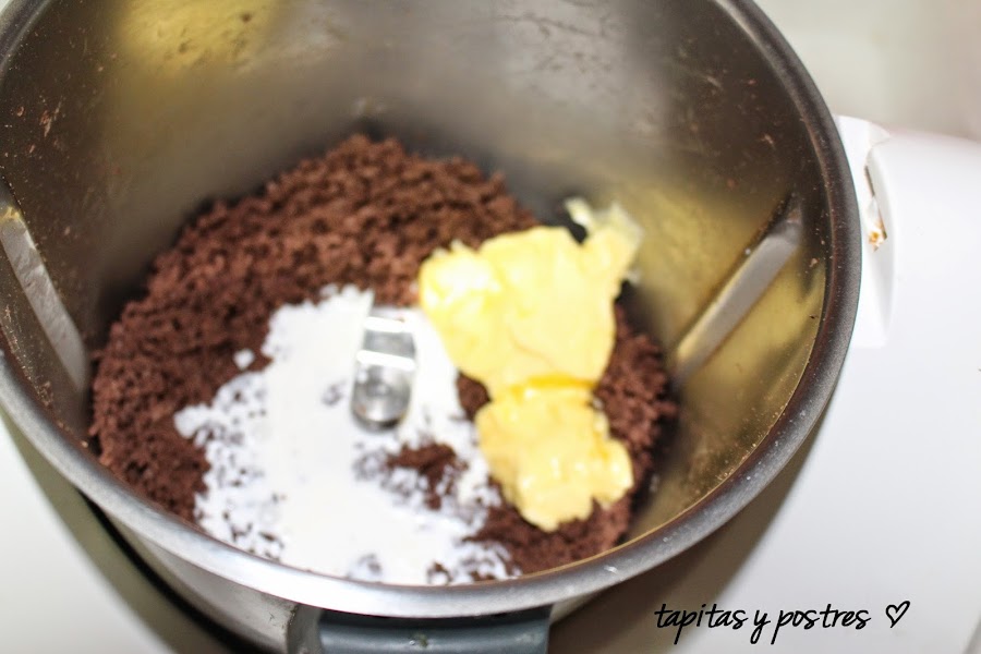 Cuando la tarta haya cuajado bien hacemos la cobertura. Trituramos el chocolate en la thermomix unos cinco segundos a velocidad 5-10.