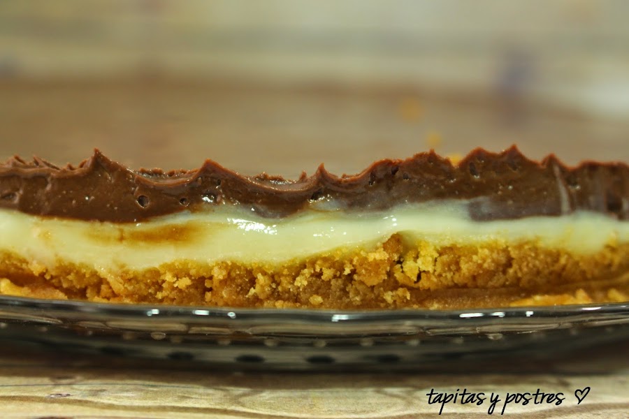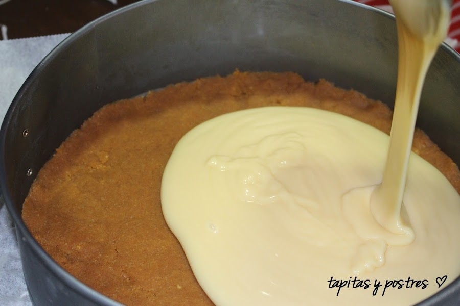 Vertemos esta mezcla sobre la base de galletas y dejamos que enfríe un poco antes de meter en la nevera un par de horas como mínimo.