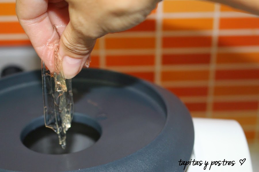 Unos cinco minutos antes de acabar, ponemos tres hojas de gelatina en agua fría y cuando quede un minuto para acabar la mezcla, escurrimos la gelatina y sin parar la máquina la echamos por el bocal. Dejamos que se integre bien en la mezcla.