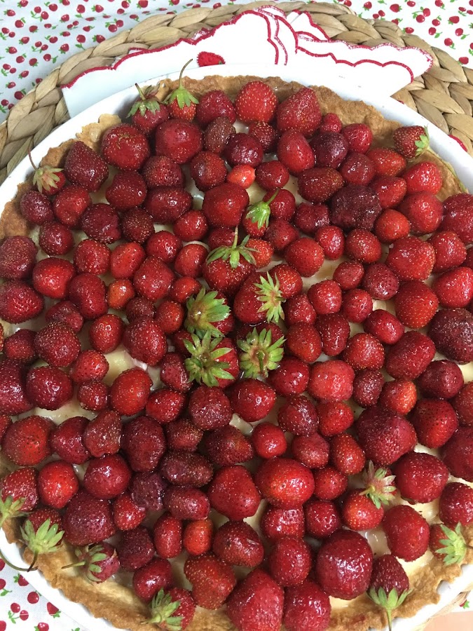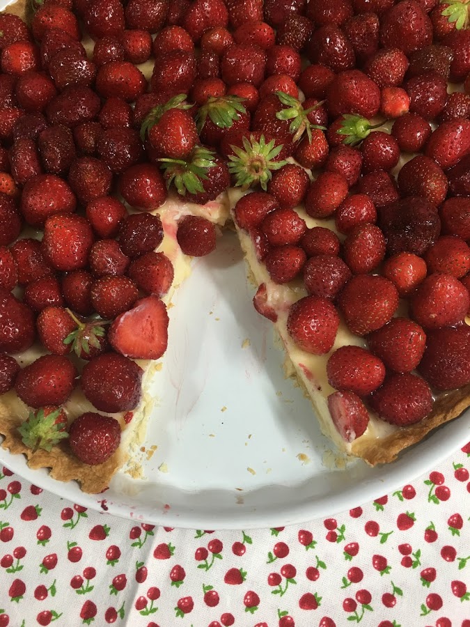Una vez frías la masa y la crema se procede a montar la tarta. se cubre la masa con la crema de vainilla. se lavan las fresas y se les quita el rabito (excepto a unas pocas que puse con él para darle un aire más rústico).