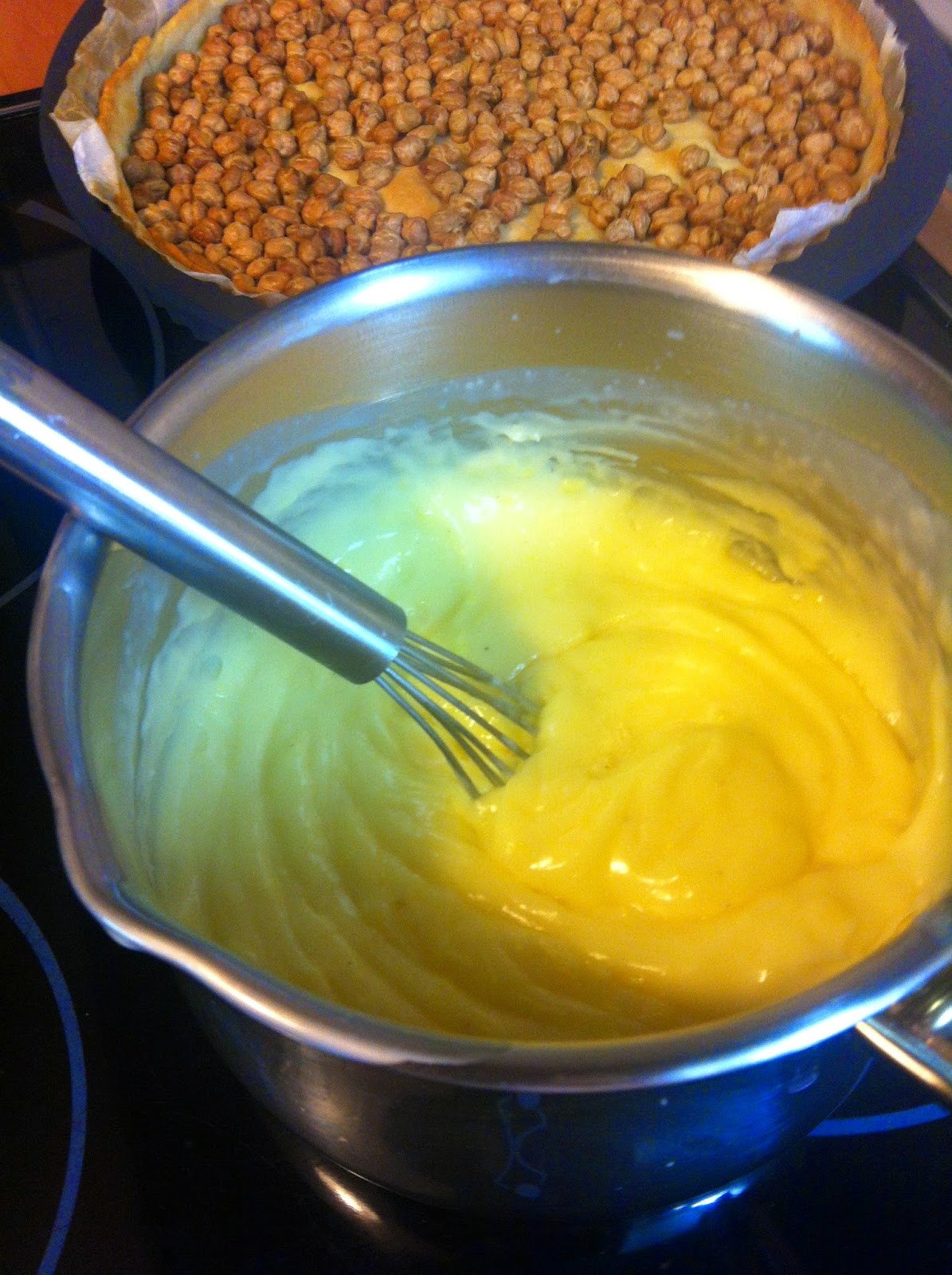 Se quitan los garbanzos de la masa horneada y se vierte la crema de vainilla, alisando con una espátula.