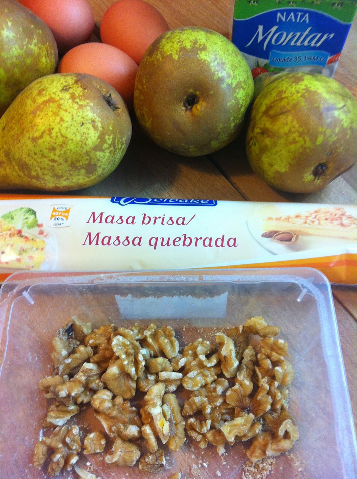 Se cubre con las rodajas de pera, colocándolas de forma acaballada. Se derrite la mantequilla y se pintan las peras con ella. Se añade la miel por encima y unas nueces (también puse la vaina de vainilla cortada en dos y unos anises estrellados) y se hornea durante 1/2 hora.
