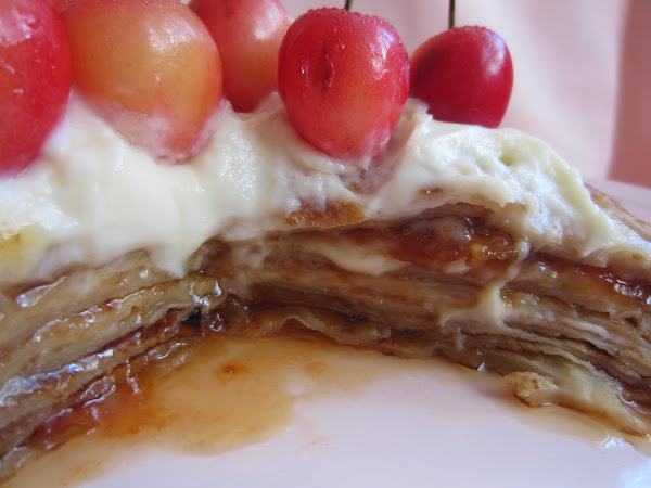 TARTA DE CREPES CON MERMELADA DE CEREZAS Y CREMA DE YOGUR Y QUESO