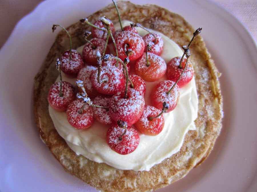 Vamos alternando una capa de crep, una capa de mermelada, otro crep y encima otra capa de mezcla de queso y yogur y así sucesivamente. Al final ponemos la mezcla de queso sobre el centro del último crep; extendemos, pero sin llegar a los bordes y colocamos encima las cerezas.