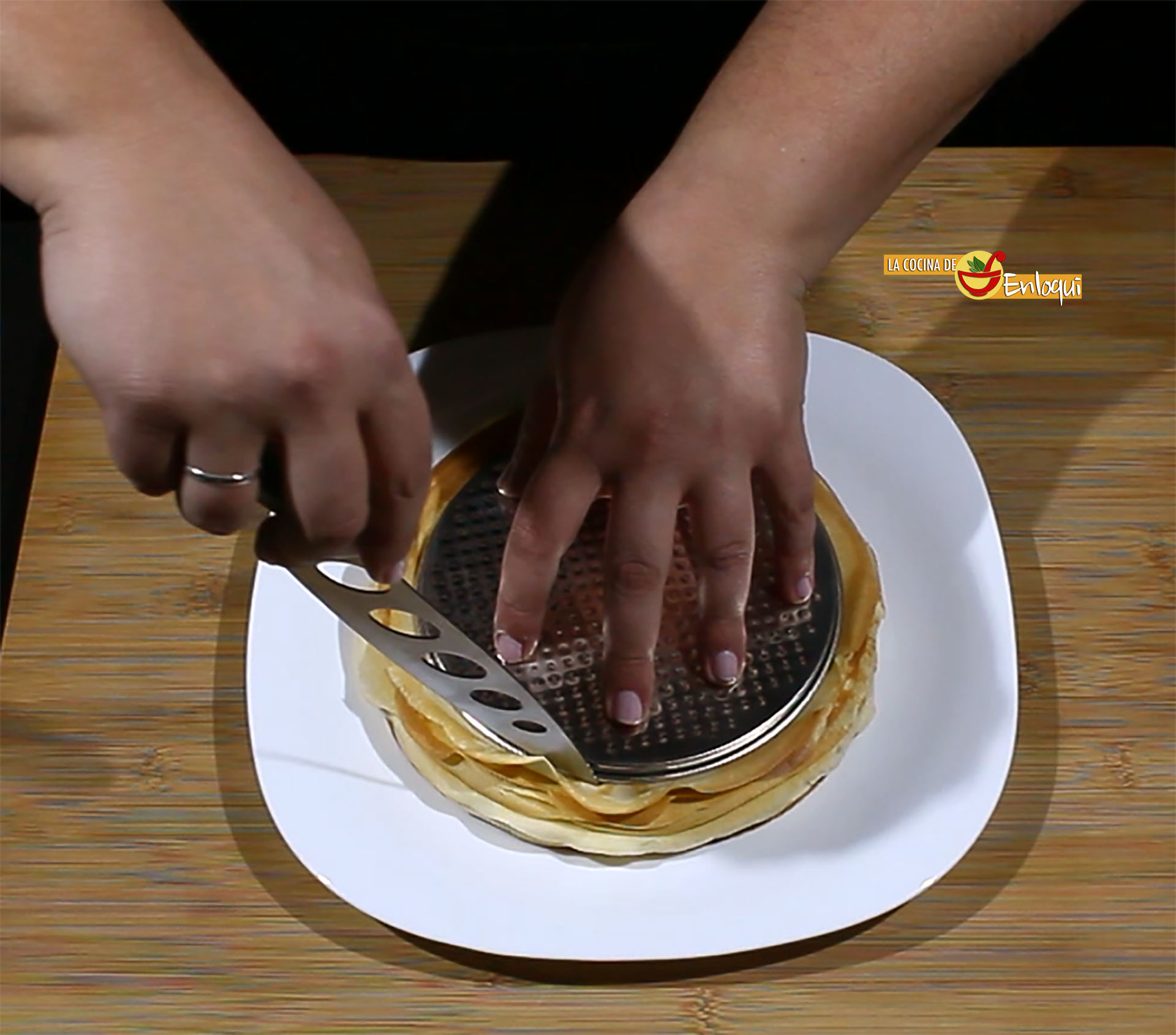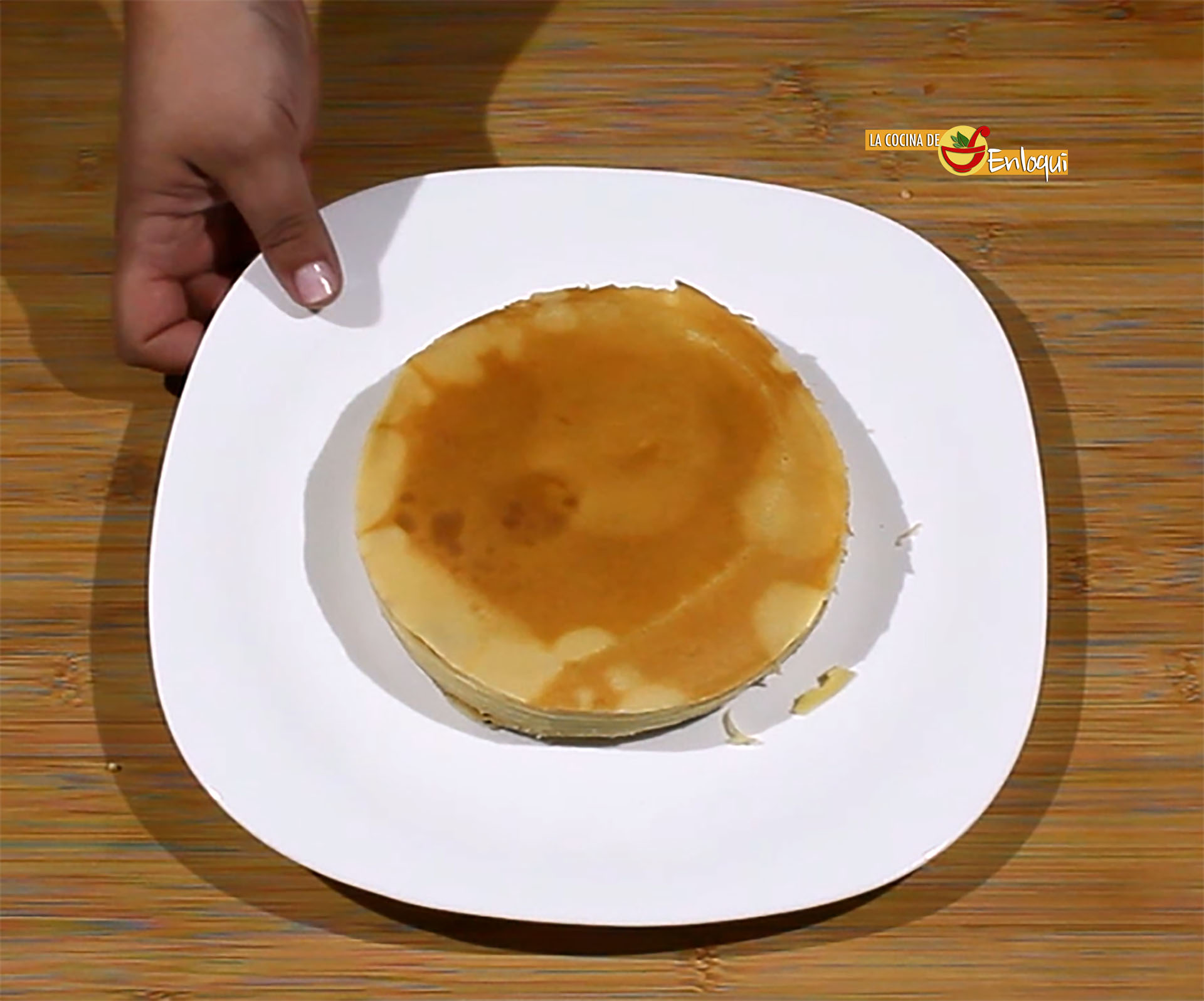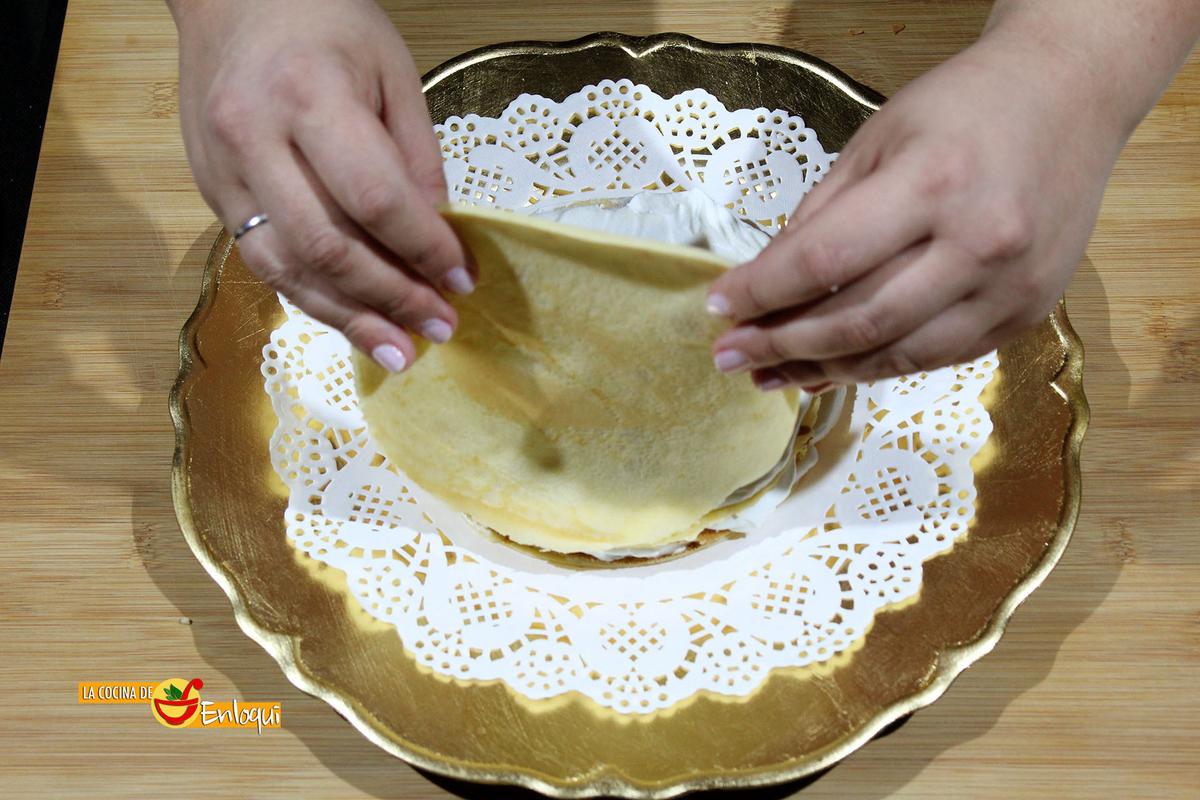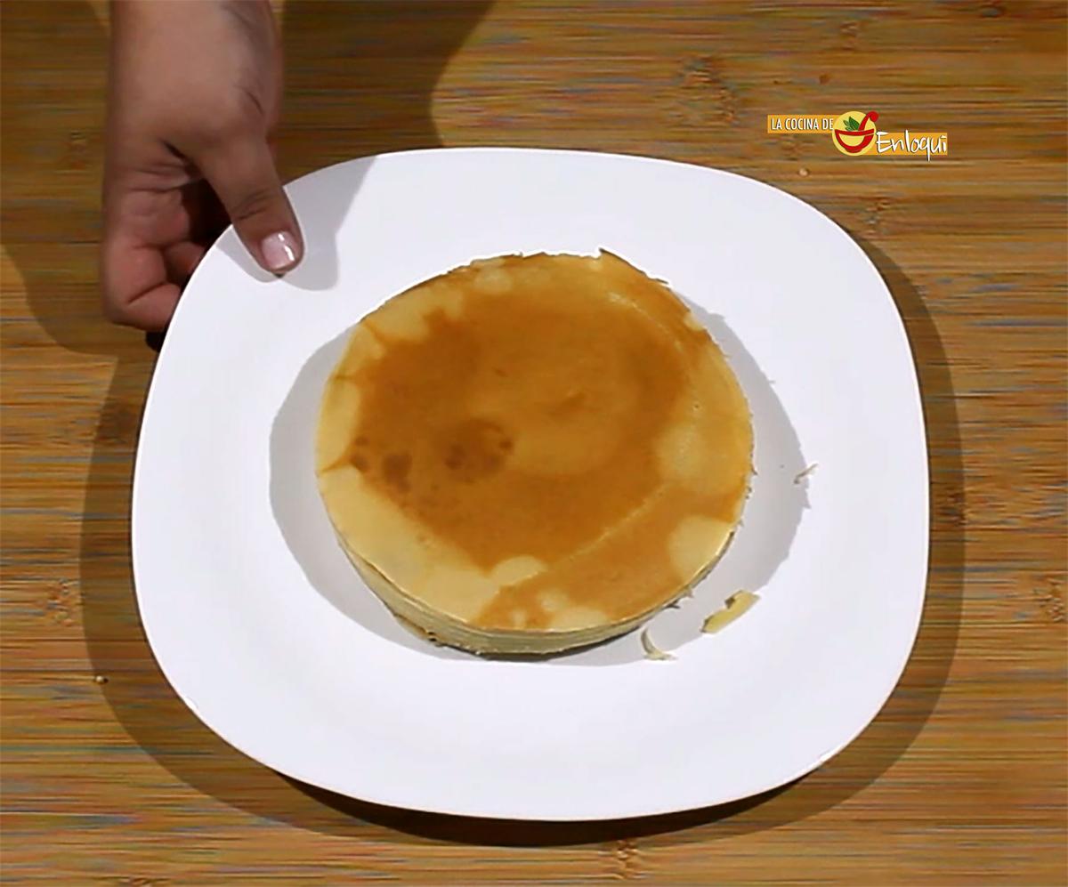Para comenzar a montar la tarta, te recomiendo que, con la ayuda de un plato o un molde redondo, cortes las crepes. Así eliminas los bordes y quedan todas del mismo tamaño, quedará mucho más bonita tu tarta.