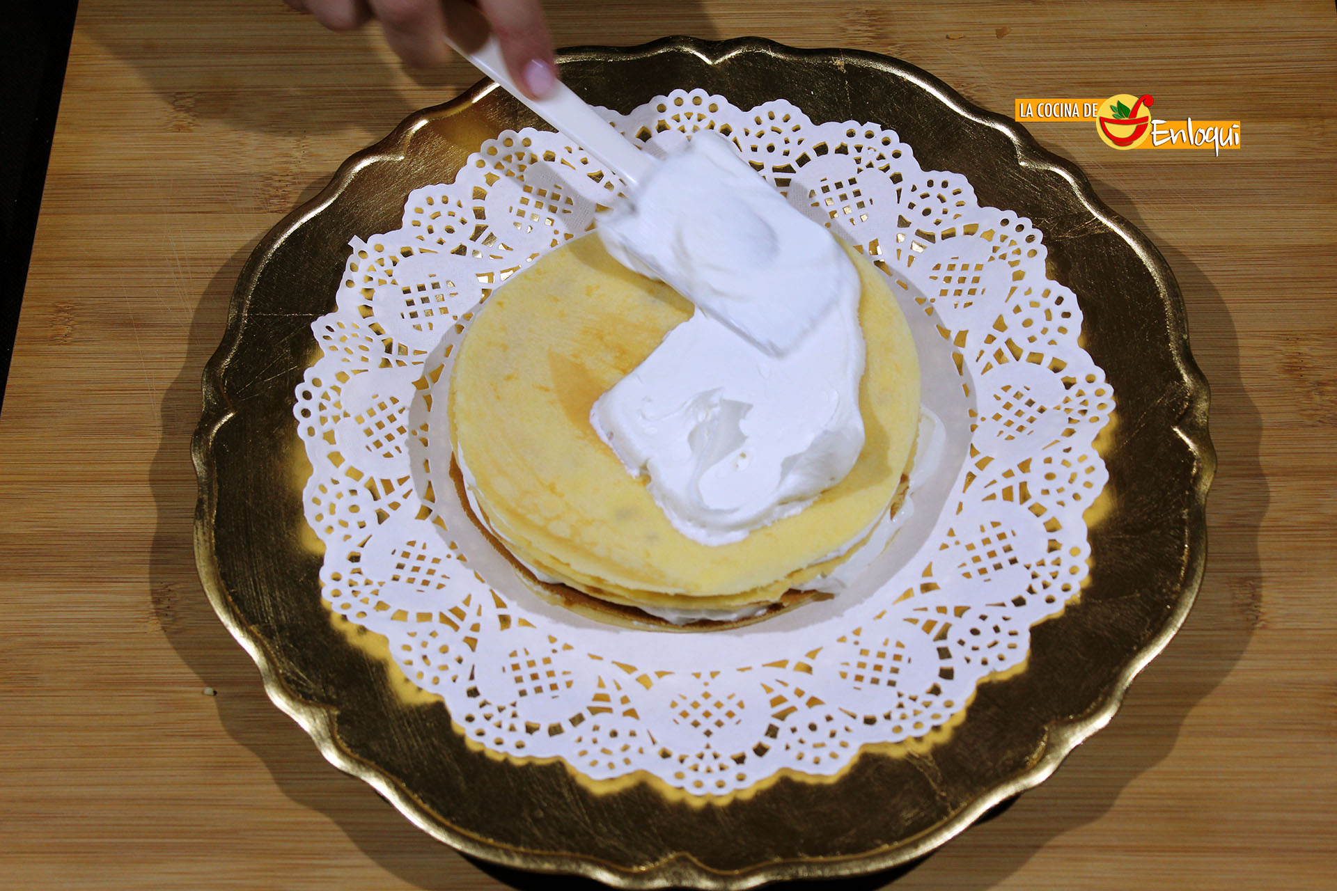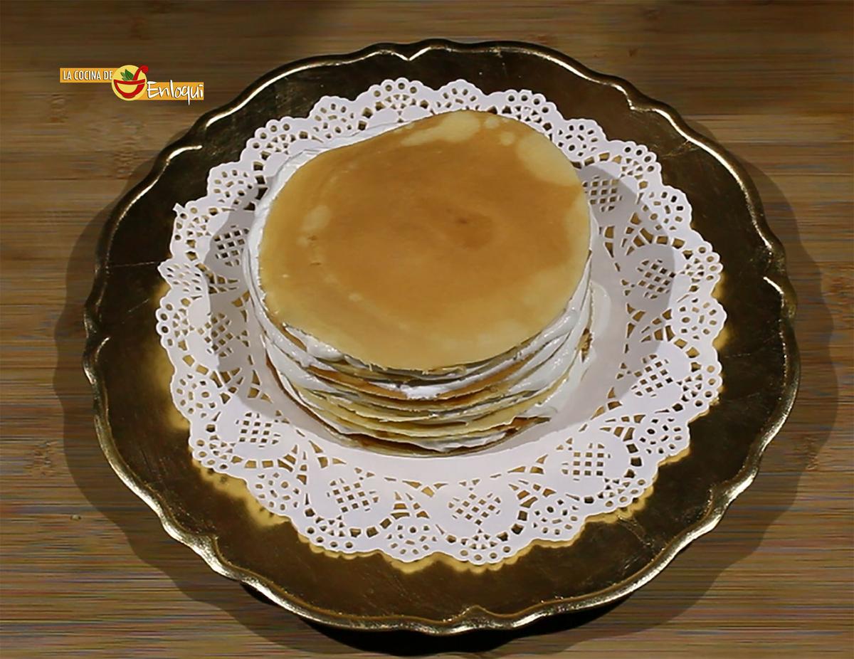 En la bandeja donde vas a presentar la tarta coloca la primera crepe, cubre con una capa de nata montada (crema de leche), extiende bien hasta los bordes y coloca encima otra crepe. Repite este proceso hasta haber colocado todas las crepes con una capa de nata montada (crema de leche) entre ellas.