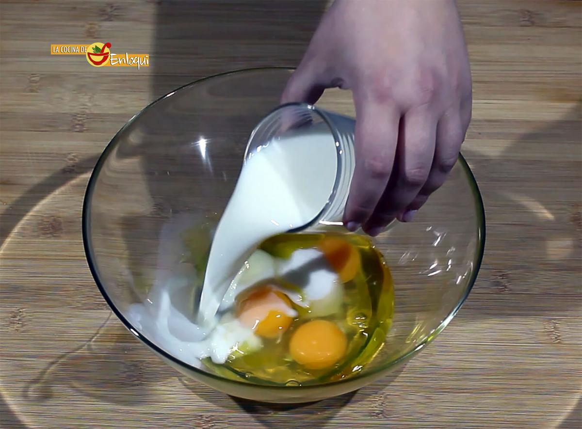 Para comenzar pon en un bol amplio los huevos, el azúcar, el aceite y la leche. Bate con las varillas para que quede todo bien mezclado. A continuación ve añadiendo poco a poco la harina tamizada, sin dejar de batir.