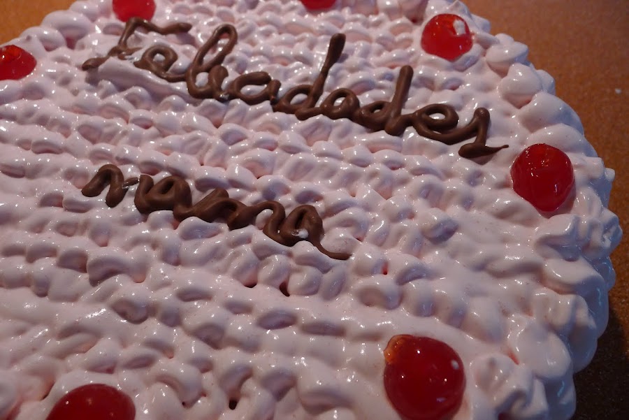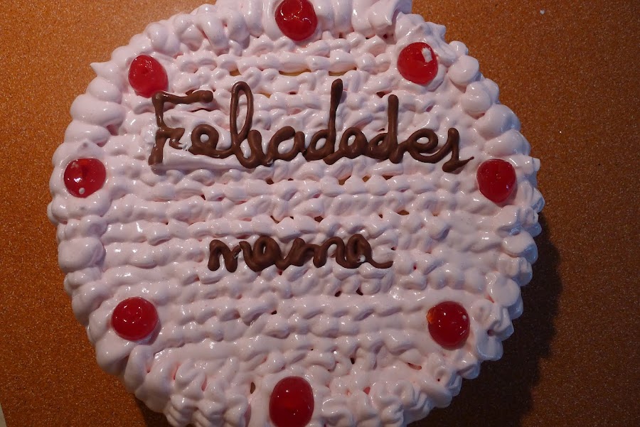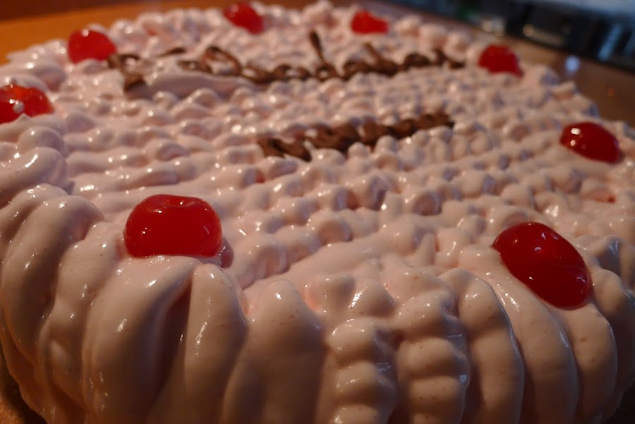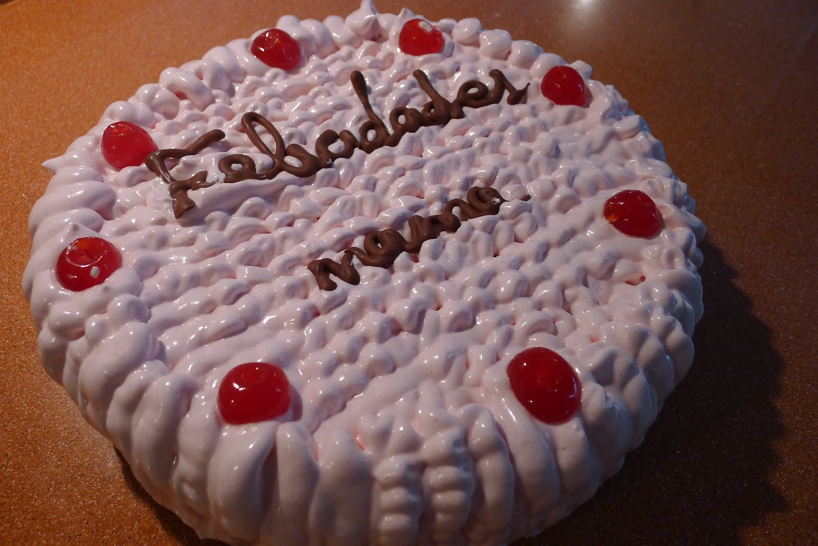 Ya os mostre en su dia con esta tarta la nata (crema de leche) rosa,con gelatina de fresa,la cual esta riquisima y he preparado muchas veces,y esta vez,quise probar(me arriesgue totalmente) a hacer lo mismo pero con el merengue y deciros que...ACIERTO TOTAL!! vamos,que si os gusta el merengue ya estais tardando en probarla! buenisima,a mi gente les encanto,a todos eh, y eso no es tarea facil! hasta a mi costillo que el merengue no le va! no os digo na...algunos coincidian en que olia y sabia a chuches!...lo unico, que no aguanta tanto firme como la nata (crema de leche),pero aun asi aguanta mas que sin la gelatina,asi que si la haceis,hacer como yo,poco antes de presentarla y hasta el momento de comerla en el frigo,asi sin problemas....lo dicho,recomendadisima!...ojo,no hagais caso a mis churritos con mi improvisada manga pastelera eh! jeje.