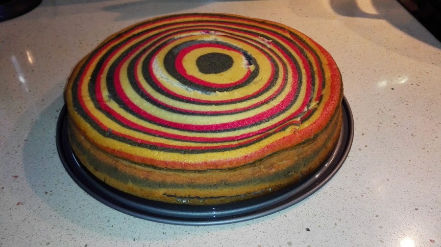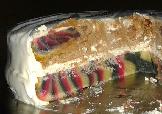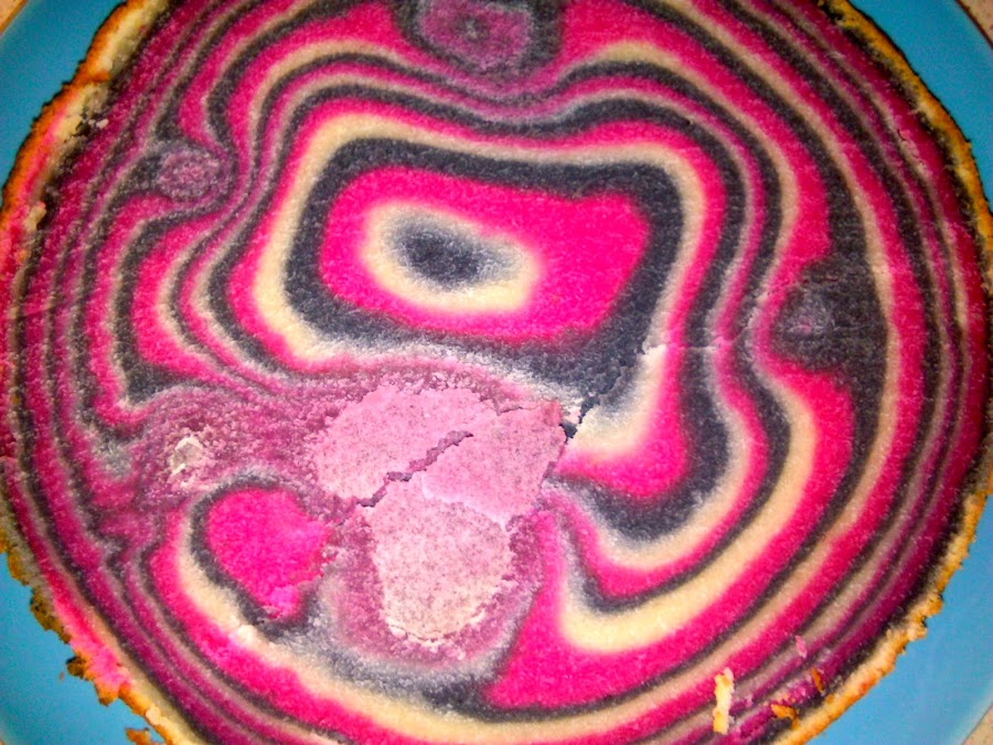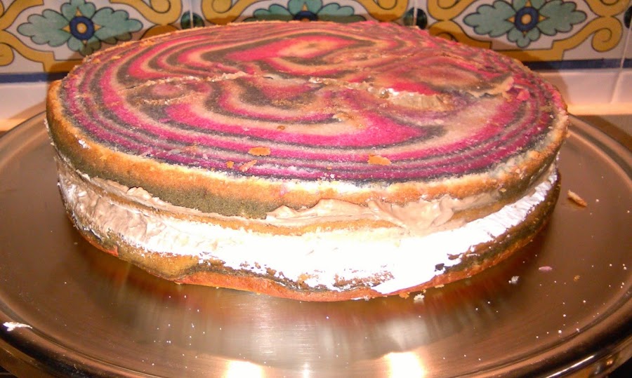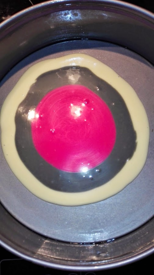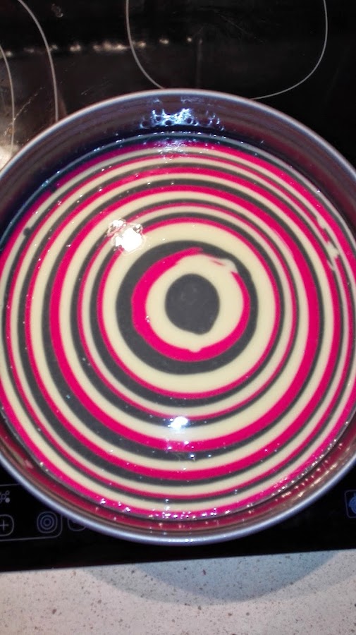 Ahora el procedimiento es muy sencillo, en el molde ya engrasado colocamos una cucharada grande de nuestra masa negra en el medio, luego en el medio de esa mancha la de color rosa y en el medio de la de color rosa, la masa blanca, de forma que quede como en la foto. Repetimos este paso hasta que se nos acabe la masa. Así cuando cortemos, de lado quedará como un cebreado.
