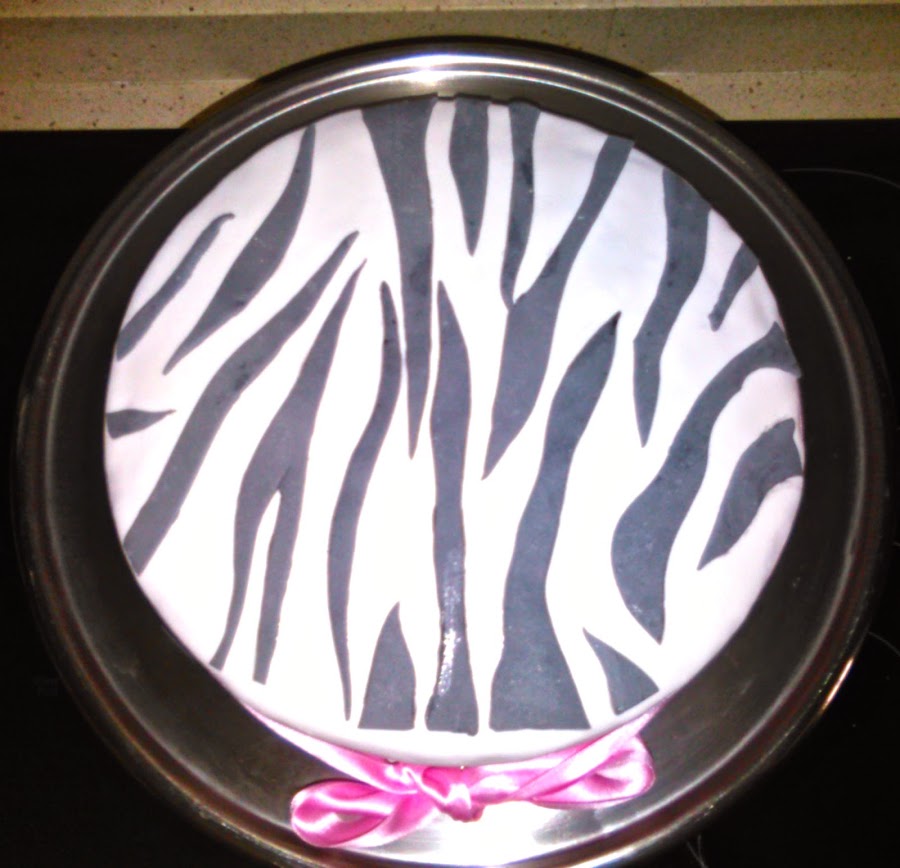 Luego, estiré el fondant negro y con un cortador para pizzas fui recortando líneas irregulares para imitar el estampado de la cebra y si podemos contar con cmc para pegar nuestras líneas mejor, sino simplemente con un poquito de nata (crema de leche) para hacer de pegamento.