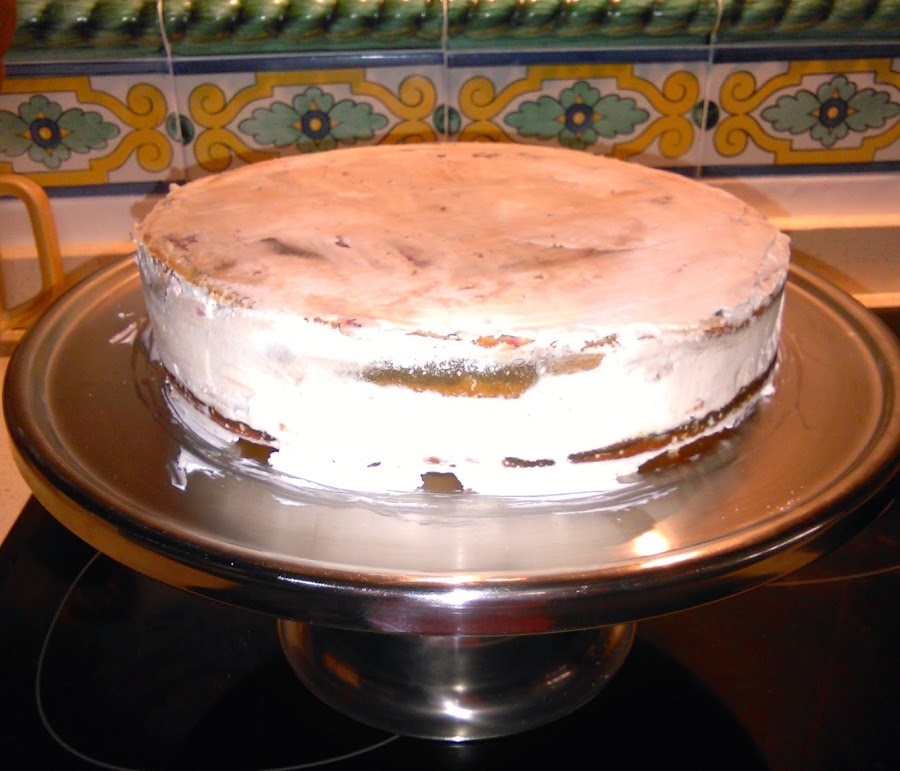 Partimos el bizcocho por la mitad y en una mitad ponemos la capa de nata (crema de leche) (depende el gusto, yo pongo una capa gordita) y en la otra mitad la de nutella y luego juntamos las dos capas de modo que la parte de abajo del bizcocho quede arriba, porque es la que está más recta y así luego para colocar nuestro fondant nos facilita el alisado.