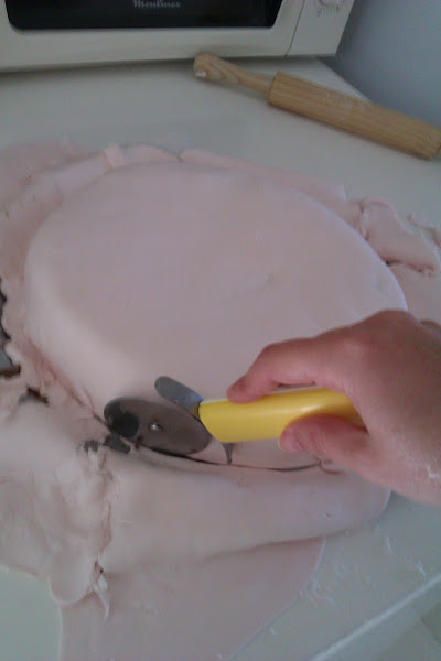Luego amasaremos cada trozo por separado con el rodillo y el papel y con los moldes obtendremos las formas que decoraran nuestra tarta.